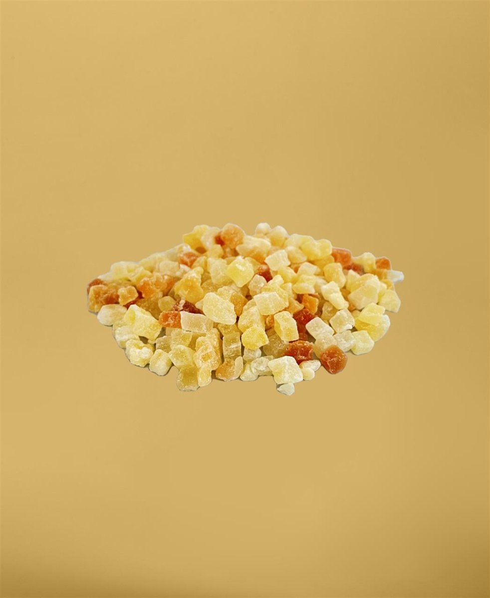 Unsere exotische Zusammenstellung von exotischen Früchten: Cantaloupe-Melone, Ananas, Mango und Papaya sorgen für einen besonderen tropischen Touch! Die saftigen kandierten Früchte sind sehr harmonisch im Geschmack und bieten ein herrliches Geschmackserlebnis für zwischendurch, unterwegs, als Topping für Desserts oder im Stollen. Gehen Sie auf eine Geschmacksreise mit unserem Tutti-Frutti Mix - Unsere Mischung entführt Sie in die Tropen, wo Sie in eine Welt voller Freude verführt werden!