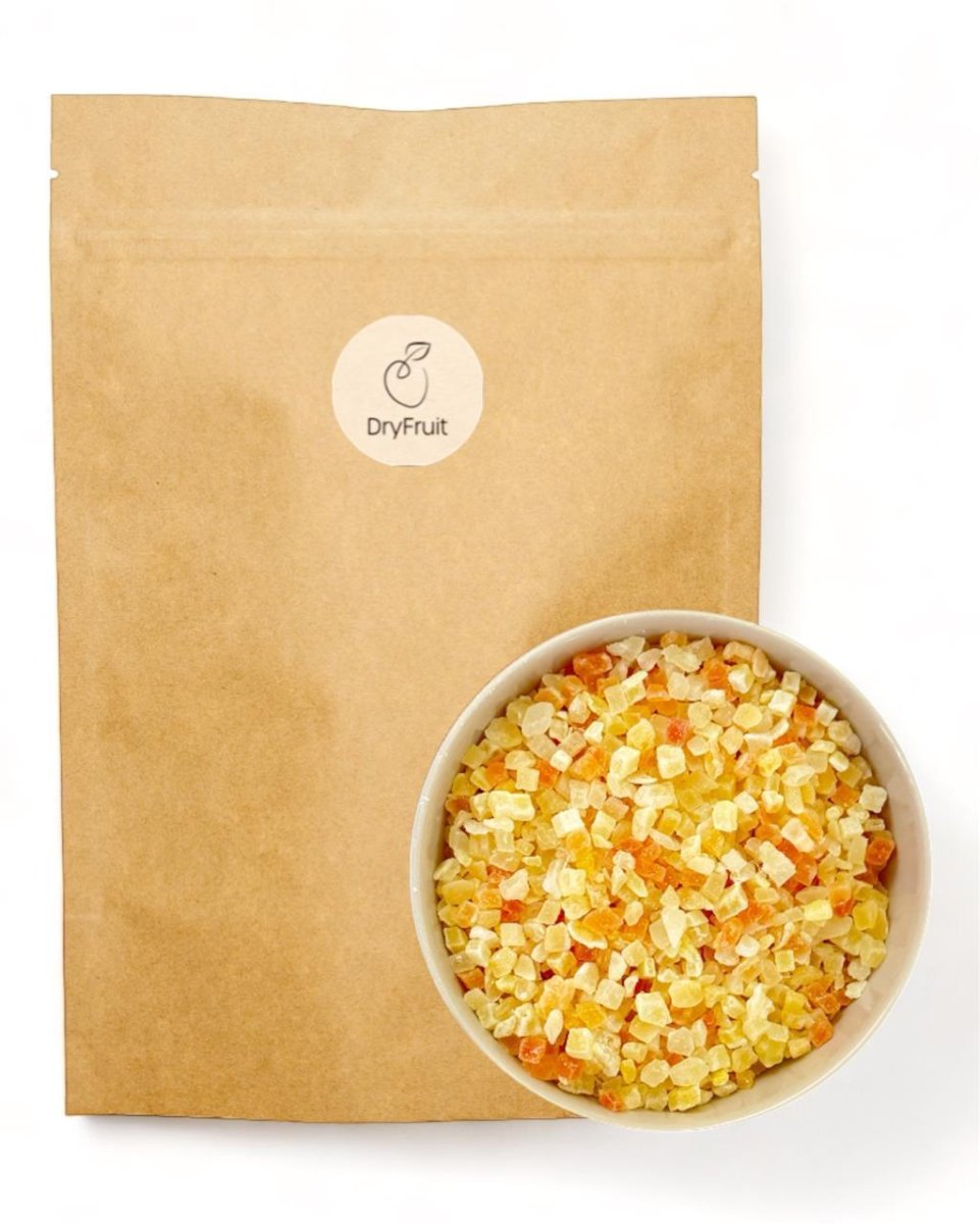 Unsere exotische Zusammenstellung von exotischen Früchten: Cantaloupe-Melone, Ananas, Mango und Papaya sorgen für einen besonderen tropischen Touch! Die saftigen kandierten Früchte sind sehr harmonisch im Geschmack und bieten ein herrliches Geschmackserlebnis für zwischendurch, unterwegs, als Topping für Desserts oder im Stollen. Gehen Sie auf eine Geschmacksreise mit unserem Tutti-Frutti Mix - Unsere Mischung entführt Sie in die Tropen, wo Sie in eine Welt voller Freude verführt werden!