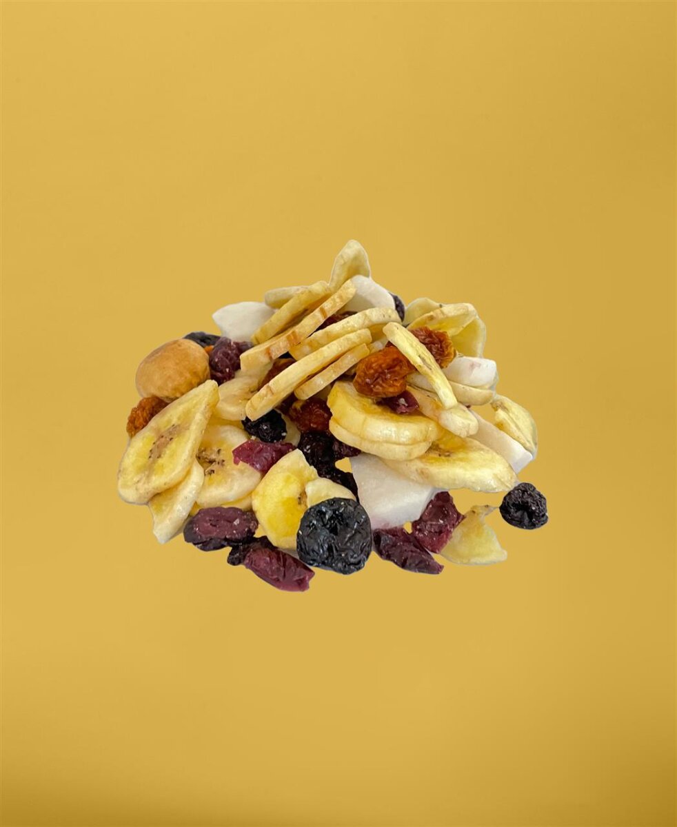 Cranberries (Cranberries, Zucker, Sonnenblumenöl), Bananenchips (Bananen, Kokosnussöl, Zucker, Honig), Kokosnusswürfel (Kokosnuss, Zucker, Antioxidationsmittel: Schwefeldioxid), Kapstachelbeeren, Zwergfeigen, Sauerkirschen / cranberries (cranberries, sugar, sunflower oil), banana chips (bananas, coconut oil, sugar, honey), coconut chunks (coconut, sugar, antioxidant: sulfur dioxide), physalis, mini figs, sour cherries